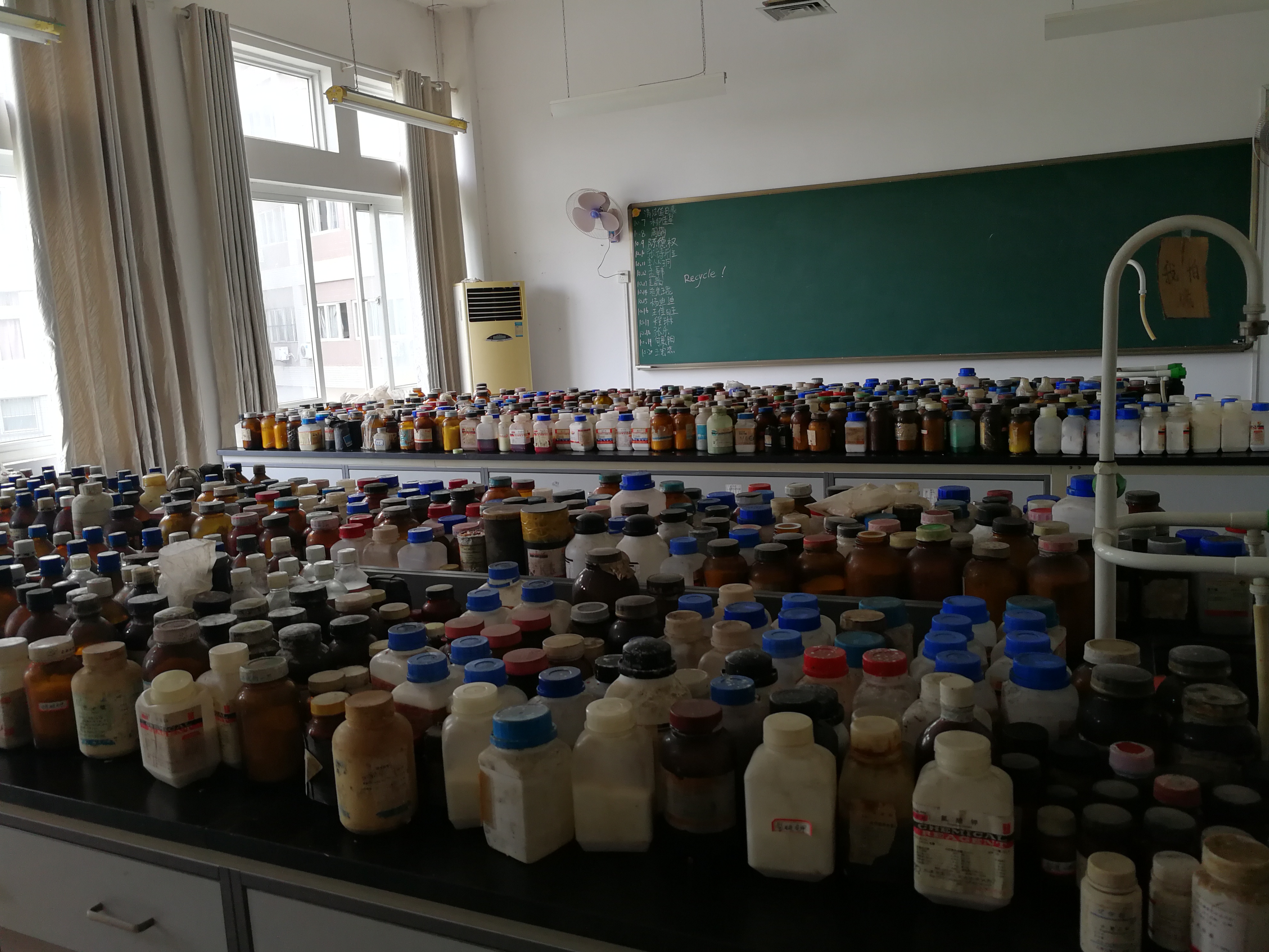 危化品是需要合适的温度,从地下室搬上楼的危化品已经4天了,担心温度高会引起爆炸,学院组织老师将搬上来的危化品进行清理分类,并向校领导汇报,要求架设一条专用电线,确保危化品实验室空调能启动。学校领导十分的关心化学楼上危化品的安全,多位领导前来指导,并迅速协调开通专线为药品室供电降温。