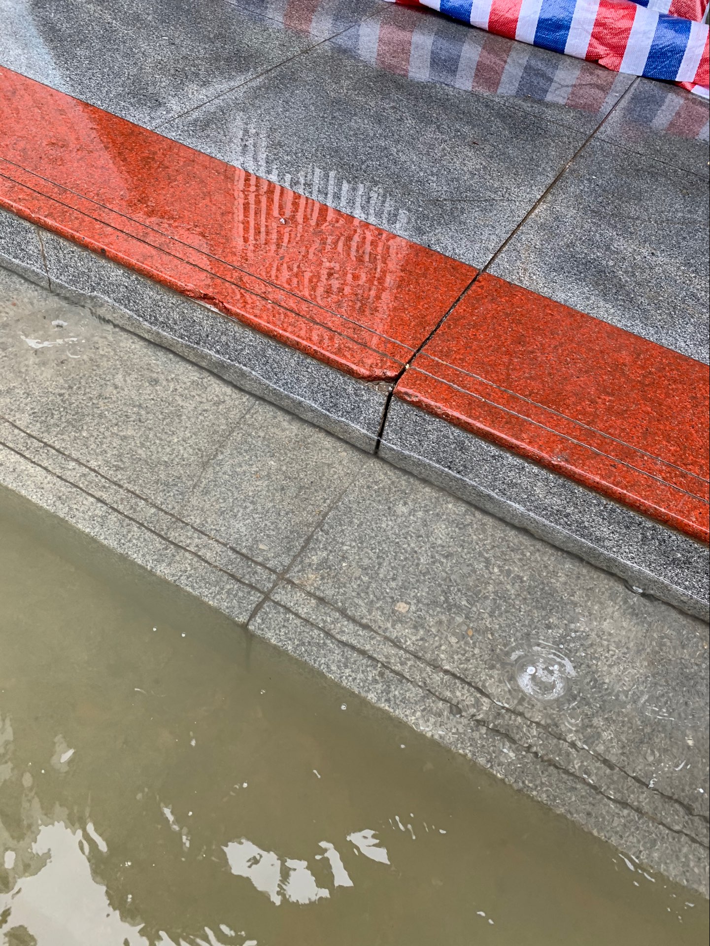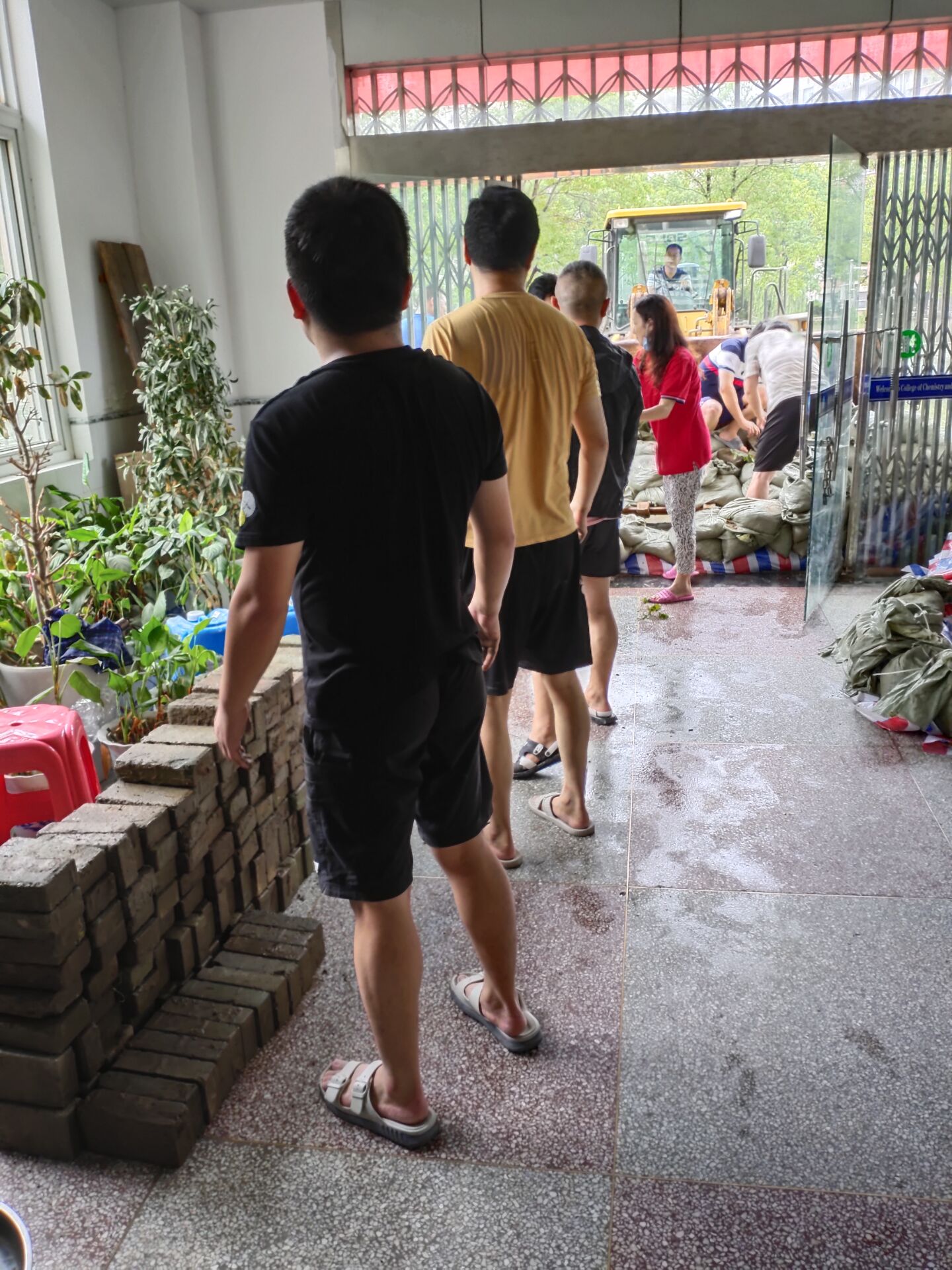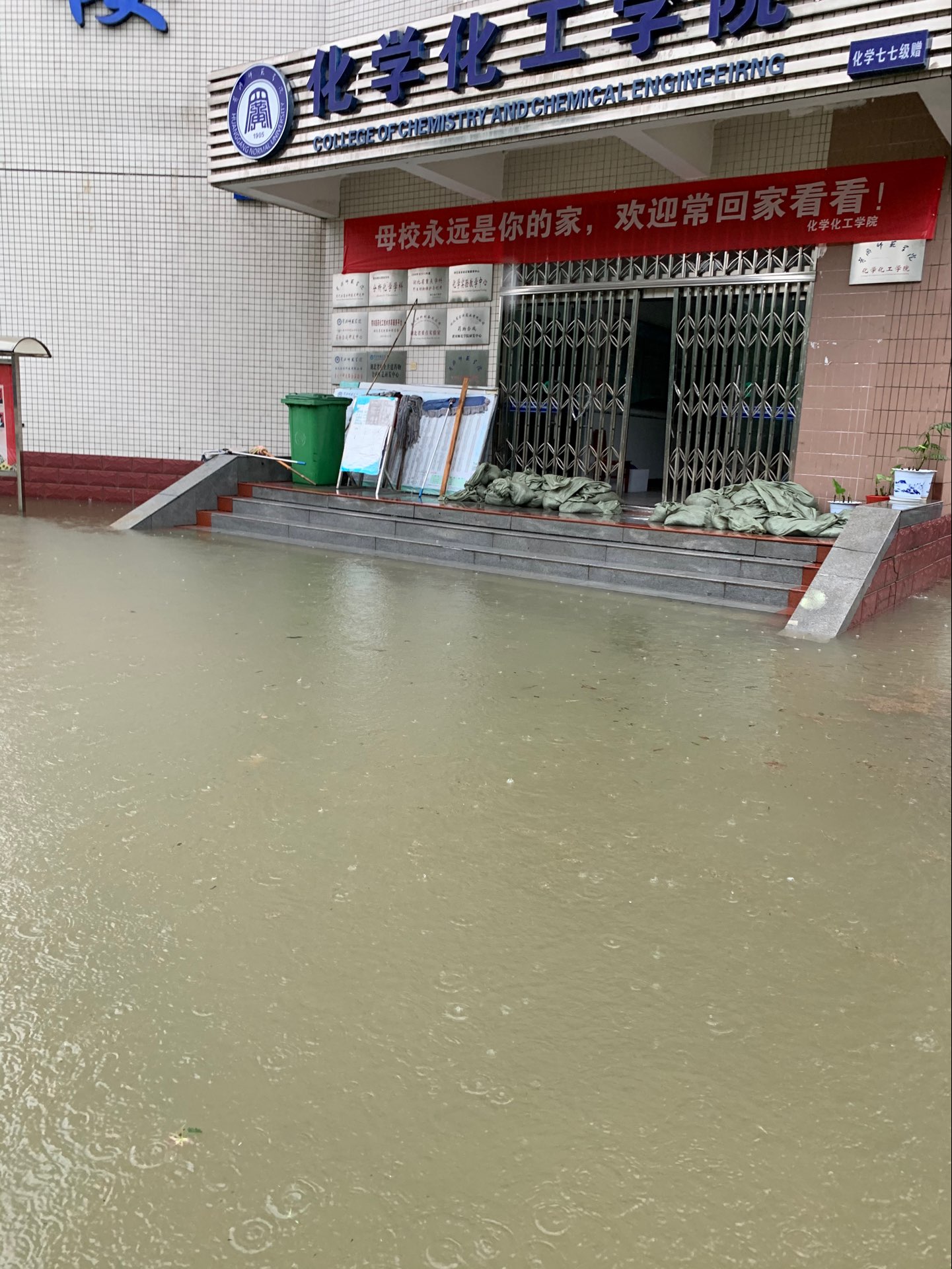 雨在哗啦啦的下,水位在嗖嗖的上升,水面已达一楼的第三个台阶, 担心晚上水面漫过所有台阶进入一楼。又接到学校通知市防汛指挥部有关专家预测,8日不下雨,长河全线水位上涨10公分左右,提醒我校南北校区一楼都要做好进水准备,请校内各单位迅速转移一楼重要物资和设备。南北校区水位达到了高压配电房的极限水位,市供电公司关掉了南区总电源。 一楼是我们刚建好的“化学分析测试中心”,集中了学院所有的高端精密仪器设备,一旦进水,损失惨重。晚上11点施书记指挥,龙涛院长带领叶辉丶阮志军丶肖延量和万柳等青年教师克服困境,不顾个人安危,深夜在伸手不见五指(全校停电)的深水中冒雨抢运沙袋到化学楼大门、新材料研究院门口筑堤拦水,张万举院长、龙涛院长和刘杰丶万柳等博士晚上在学院严防死守!确保化学楼一楼设备不受损失。
