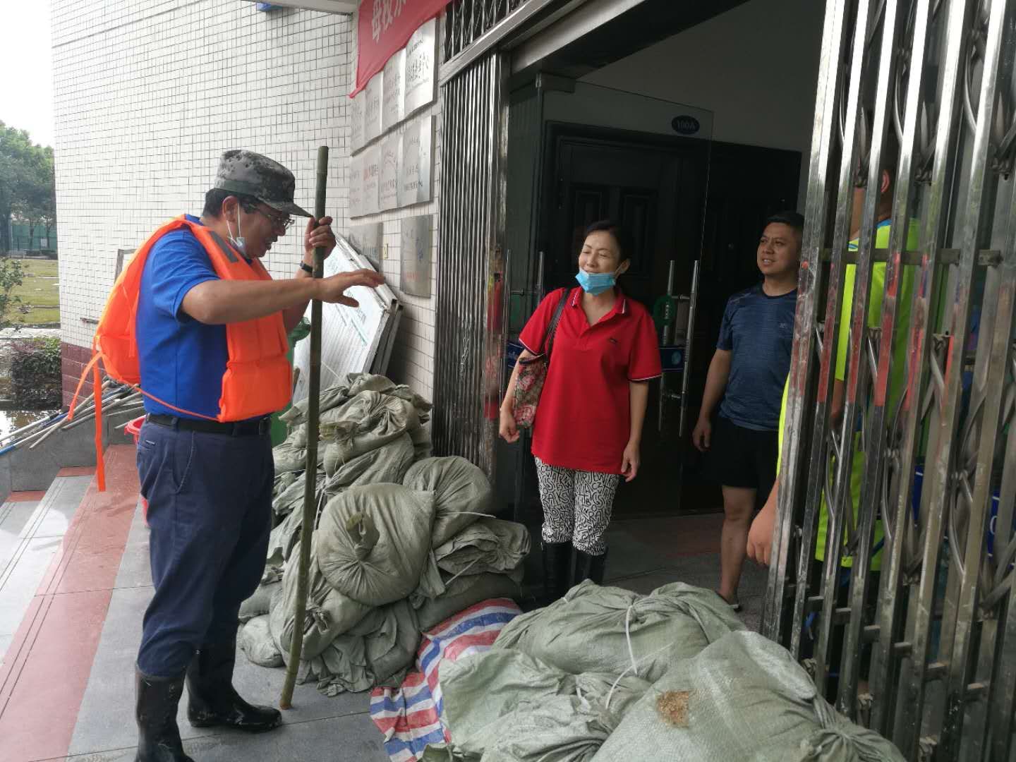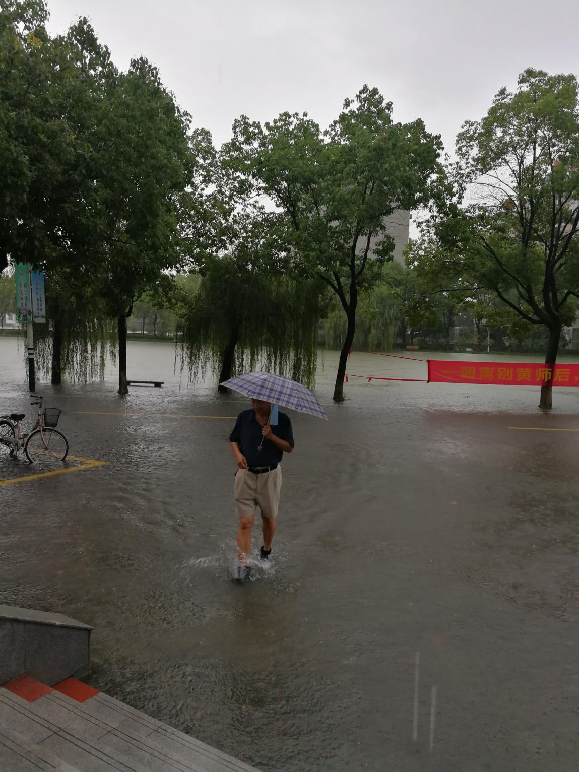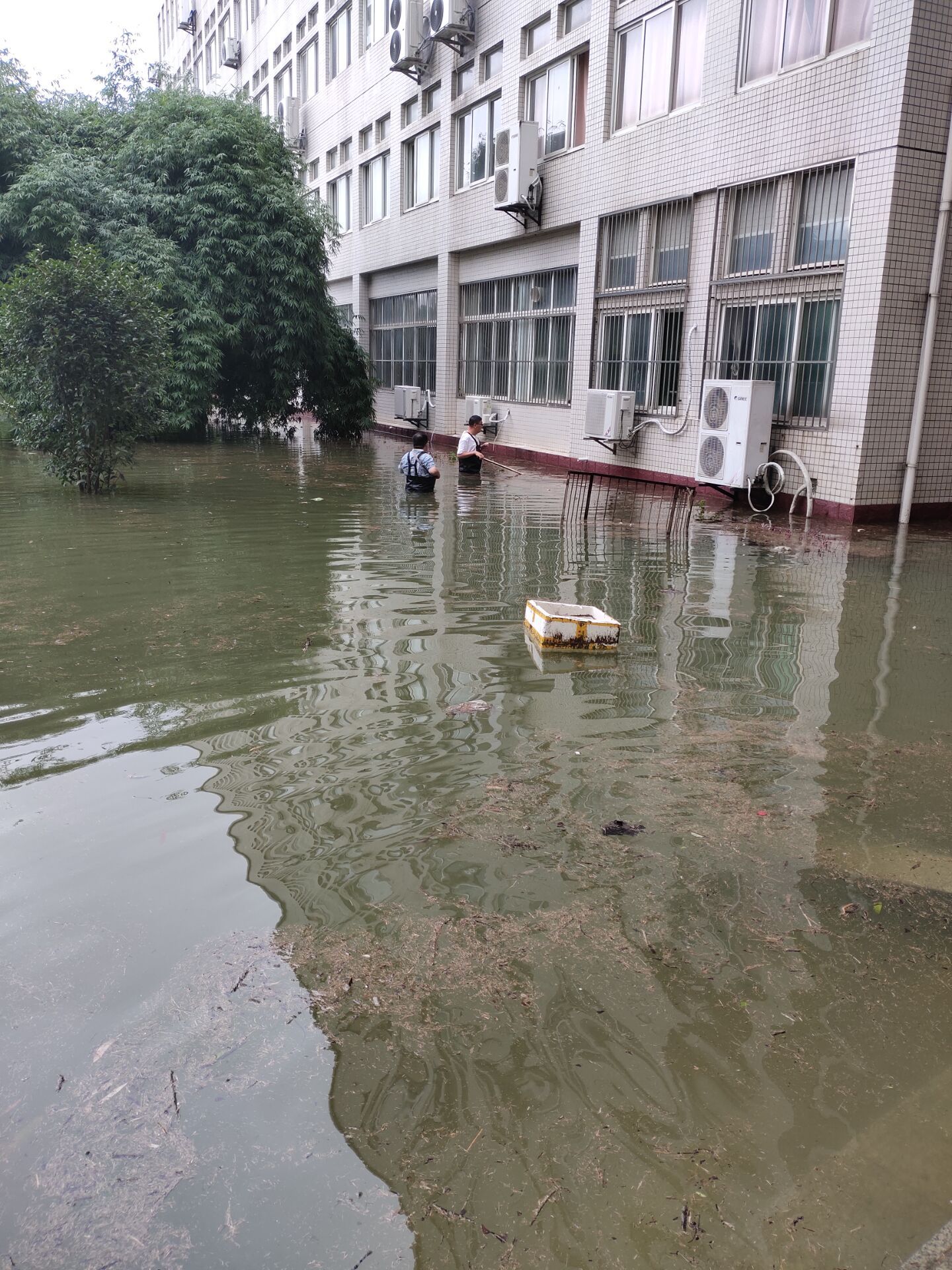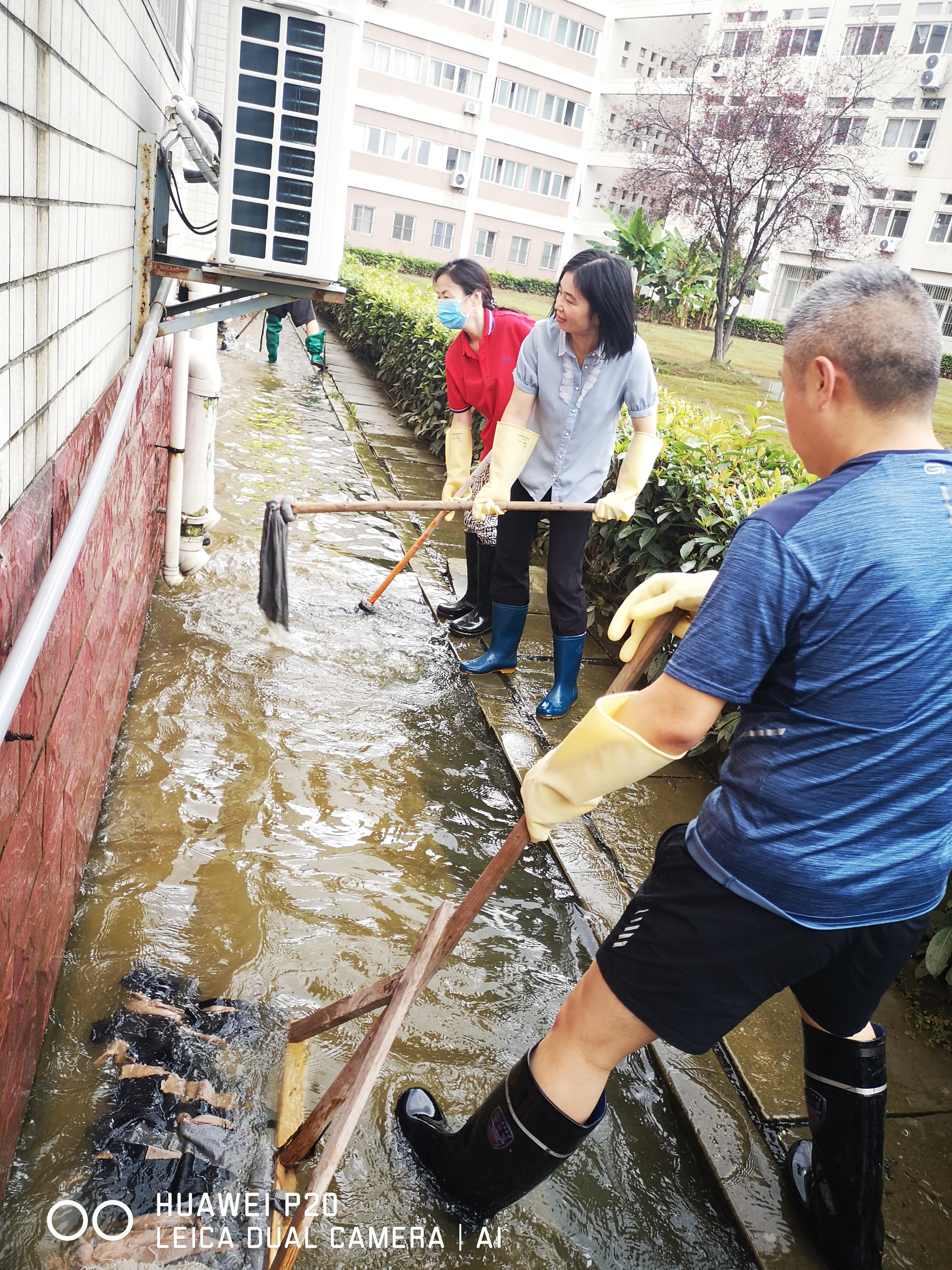 7月7日,滂沱大雨,下个不停,为了防止洪水从空调管口和下水管口倒灌,龙院长、张院长和门卫占师傅、陈建、解明江等青年教师穿着下水衣、拿着堵漏王,一个一个管口进行封堵,并请空调师傅将一楼所有空调外机上移抬高。