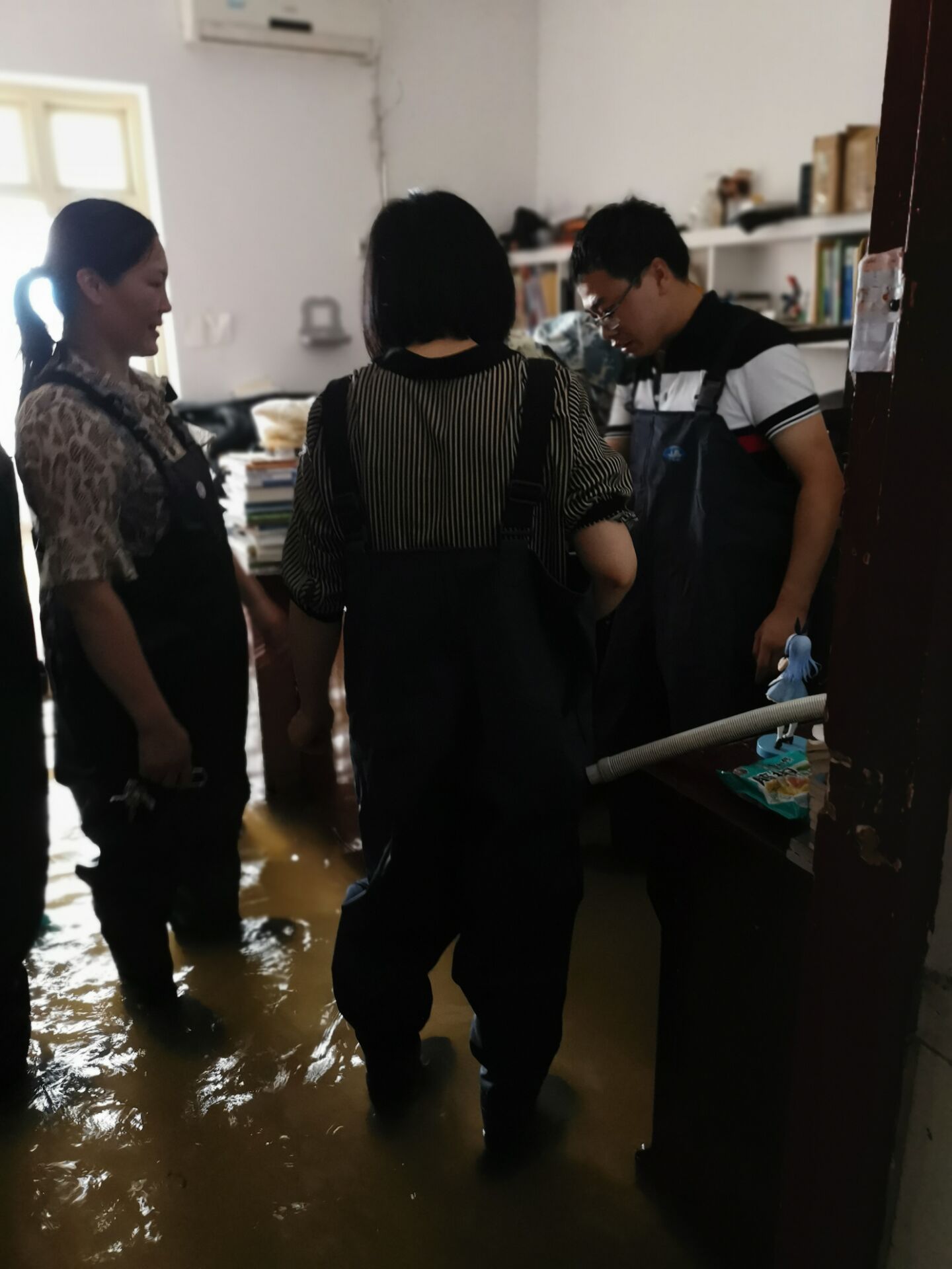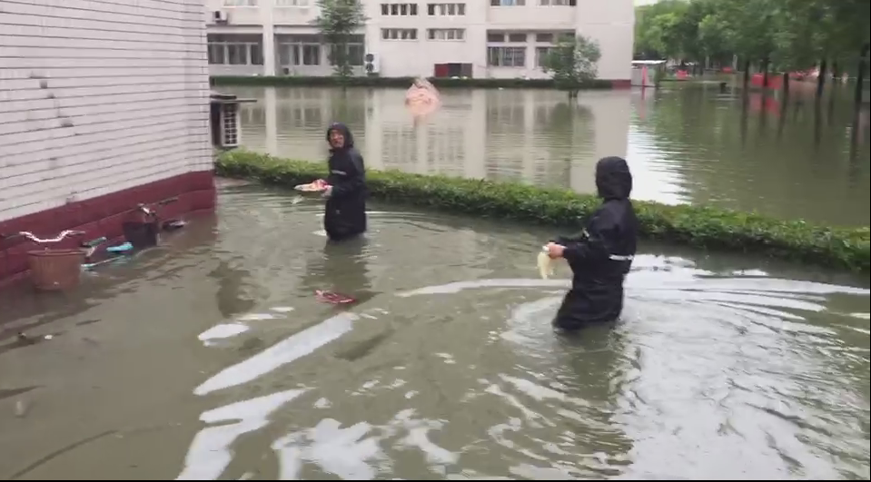 学生宿舍进水了,学院紧急组织班子成员和徐涛、林军奇等6名班主任老师对学生宿舍一楼的学生物品进行整理和抬高转移,在老师们的努力下,一楼学生的物品基本没有损失。