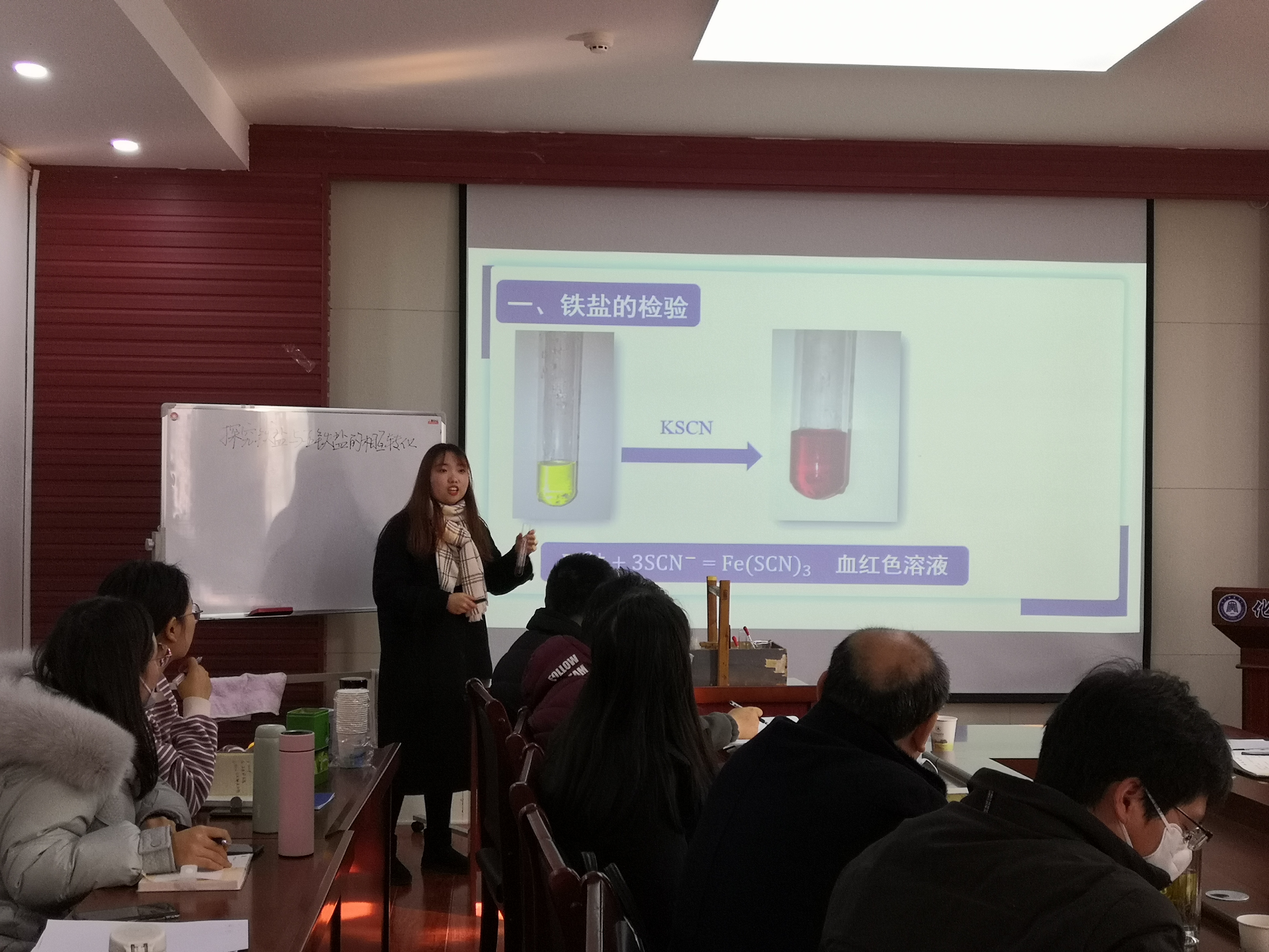 2020年12月24 日下午,韦德官方网站全体教师与黄冈中学刘海英副校长及化学教研组长熊全告老师、备课组长王恩逢老师、甘文广老师和张进老师一起在407 会议室开展了“发展化学核心素养的教学研讨”活动,2018级化学师范研究生观摩了此次教研活动。龚明丽和胡青两位教育硕士分别进行了“离子键”和“铁离子的相互转换”的微课教学,两节微课分别从微观模型建构和实验探究出发,帮助学生逐步理解物质的性质与转化、微观离子之间的相互作用力,体现了以发展学科核心素养为本的教学取向。
