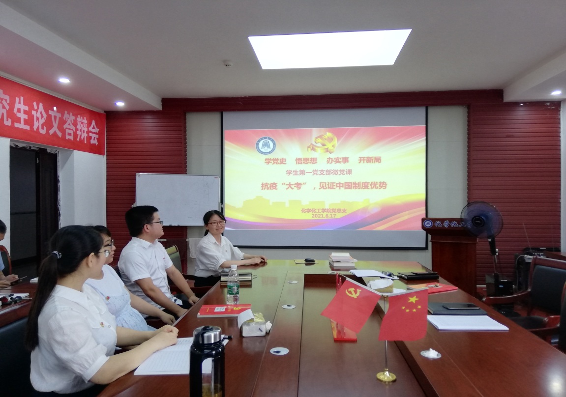 学生第一党支部书记李院林讲述微党课题为:《学党史---抗疫“大考”,见证中国制度优势所在》,向全体党员讲述了中国共产党领导和我国社会主义制度、我国国家治理体系的强大生命力和显著优越性。