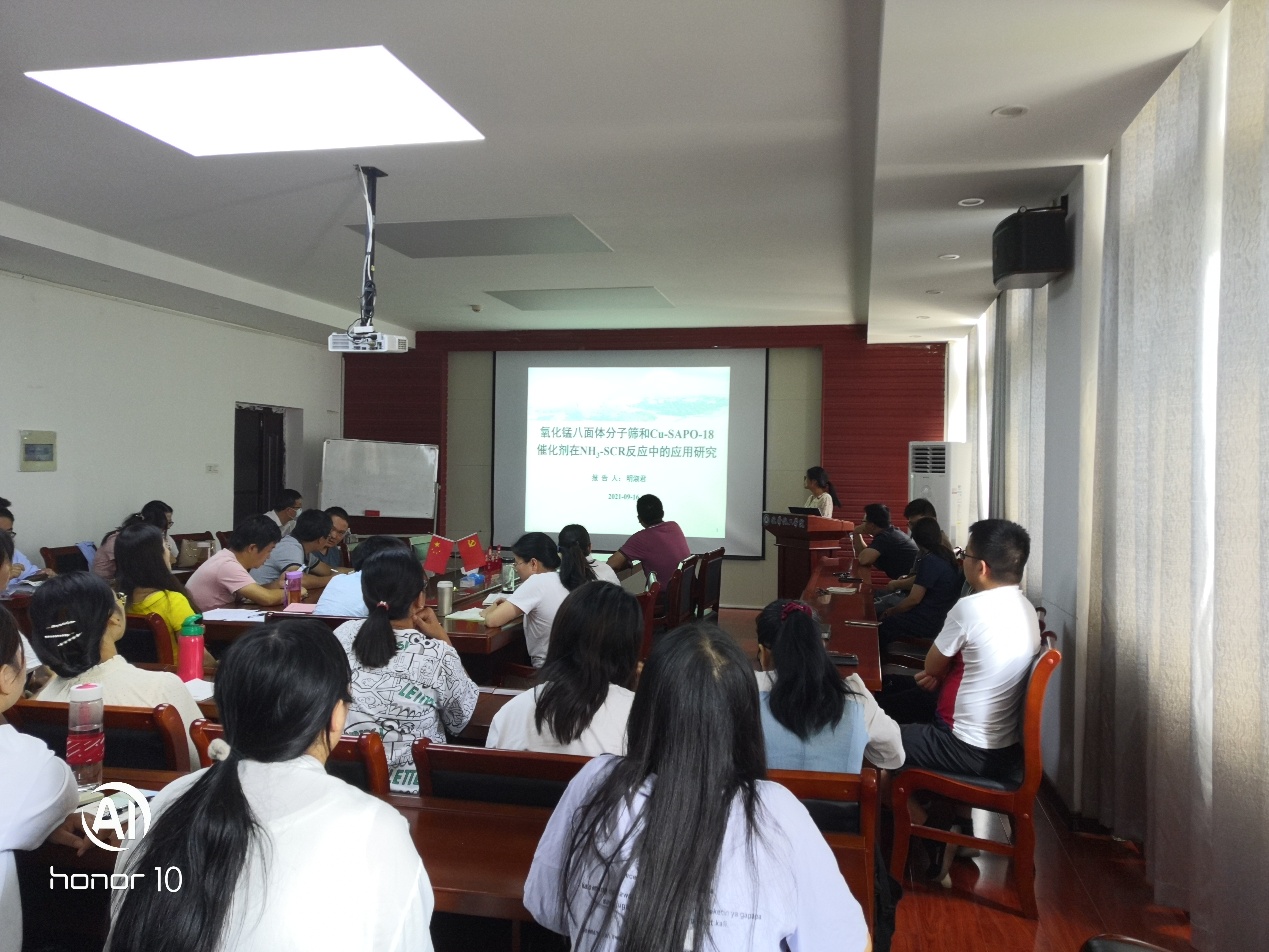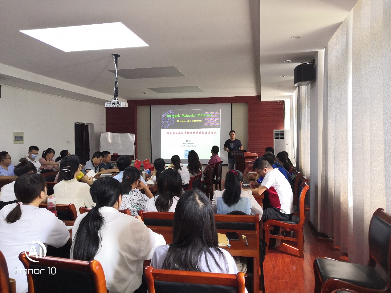 此次博士沙龙活动由新引进的四名博士做交流报告。报告题目依次是:邵东博士:《钴基双稳态分子磁性材料的设计与合成》;杨小东博士:《邻碳硼烷衍生物的制备及其光电应用研究》;岳静博士:《探究光动力治疗下线粒体内微环境变化》;明淑君博士:《氧化锰八面体分子筛和Cu-SAPO-18催化剂在NH3-SCR反应中的应用研究》。