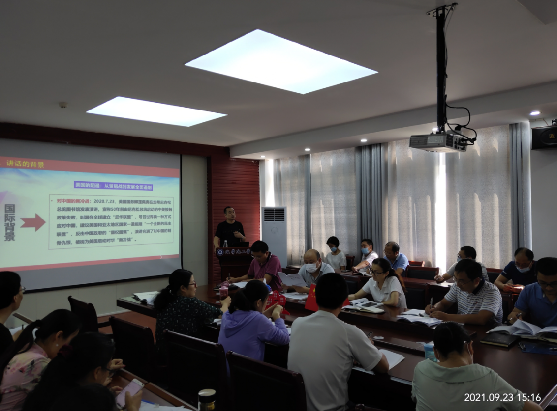 黄冈师范学院党史学习教育理论专家宣讲团成员、马克思主义学院余维祥教授以《百年辉煌昭示民族复兴》为题做了专题宣讲。余教授从“七一”讲话的国际国内背景、“七一”讲话的框架结构、“七一”讲话提出的新思想、新观点、新要求和全面贯彻落实讲话精神四个方面进行辅导,“七一”讲话闪烁着马克思主义真理光芒,是新时代中国共产党人的政治宣言,是实现第二个百年奋斗目标的行动纲领。从党的百年奋斗历程,我们深深体会到了“中国共产党为什么能?中国特色社会主义为什么好?马克思主义为什么行?”大家纷纷表示要坚定听党话跟党走,全面贯彻落实讲话精神,为党育人,为国育才,为中华民族伟大复兴贡献力量!