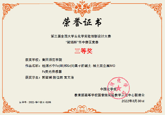 在此次全国大学生化学实验创新设计竞赛华中赛区中,韦德官方网站参赛教师和学生共同努力,经过初赛,在73所高校172支参赛队伍中脱颖而出,由张龑、杨一思老师指导,陶茜、陈志伟、胡小敏同学组成的代表队,进入复赛,经过作品展示和现场答辩,获得华中赛区二等奖。陈建、张燕老师指导,李辛妹、程双梅、祝小雅同学组成的代表队,陈砚美老师指导,郭慧娴、陈佳燃、黄文涛同学组成的代表队,分别获得华中赛区三等奖。