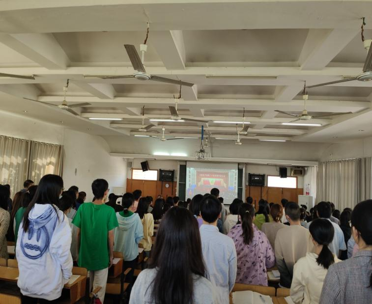 (学院师生党员在化工楼407观看)