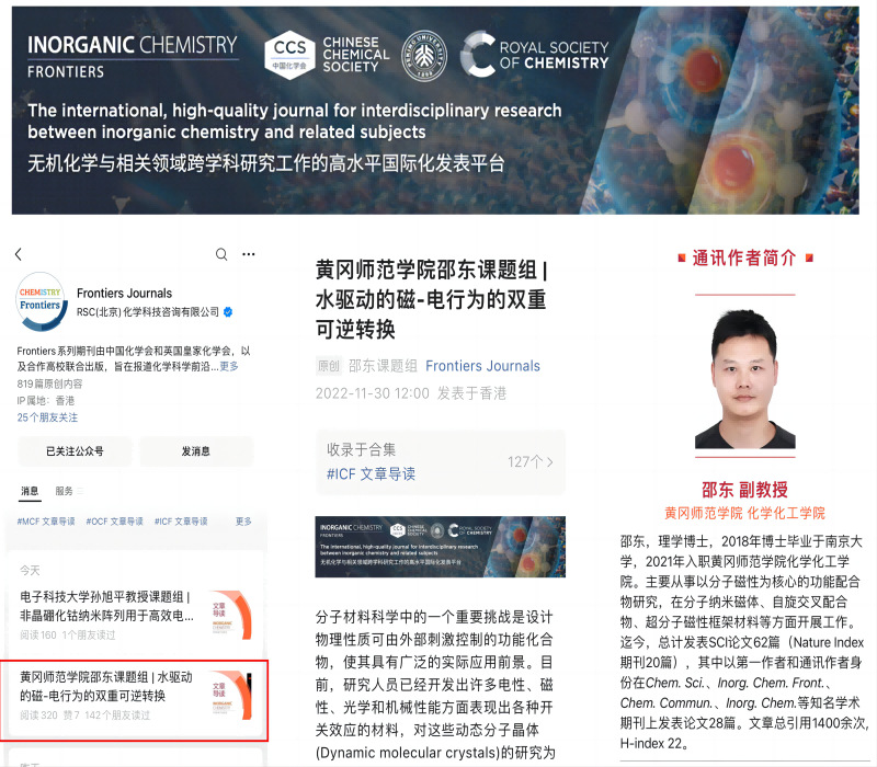 我校历来十分重视人才引进和科研质量,大力支持和鼓励教师开展高水平科学研究,发表高质量的研究成果。近年来,我校科研成果连续被著名出版社的公众号推介,是学院教师积极发表高水平学术成果的显现。据悉,邵东博士作为韦德官方网站2021年8月引进的博士后,在学校和学院的全方位支持下,来校独立工作以来他以黄冈师范学院为第一单位,以第一作者或通讯作者身份发表SCI论文15篇(一区2篇,二区4篇,三区9篇)。这些成果彰显韦德官方网站无机化学研究水平在不断攀升,青年学者锐意进取、攀登科研高峰的热情在不断增强,凸显了我校高层次人才引进带来的人才聚集效应在不断强化。