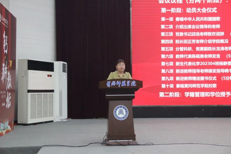 最后,入学教育动员大会在激人奋进的黄冈师范学院校歌中结束。第二阶段,副院长蒋小春进行了学籍、学历和学位授予专题教育讲座。她结合学生毕业要求和学位要求勉励各位新生认真学习,并坚持学习,合理安排个人生活,四年过后,收获属于自己的荣耀,不辜负美好的大学生活!