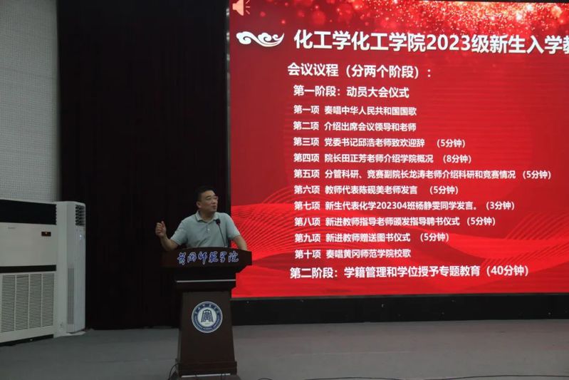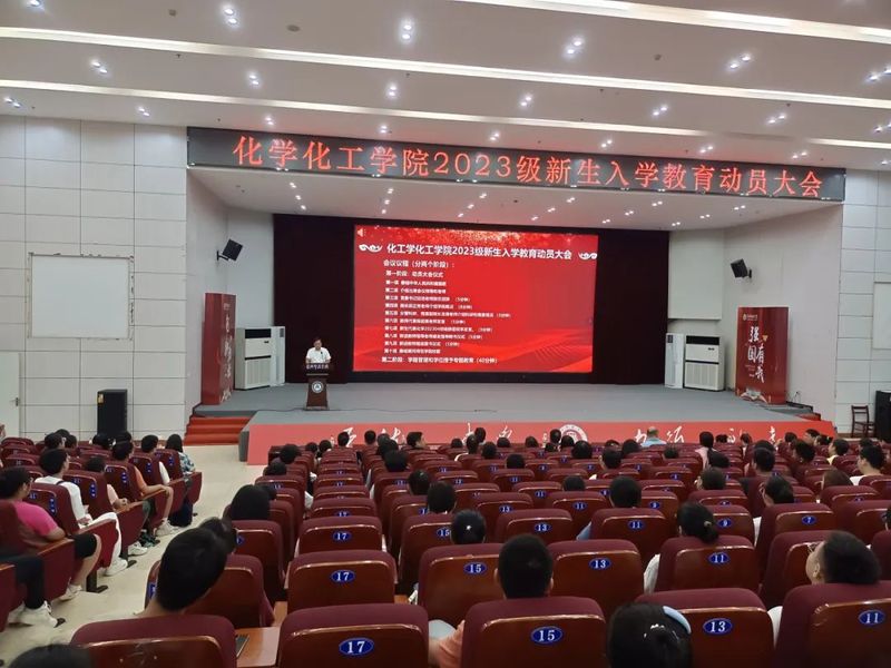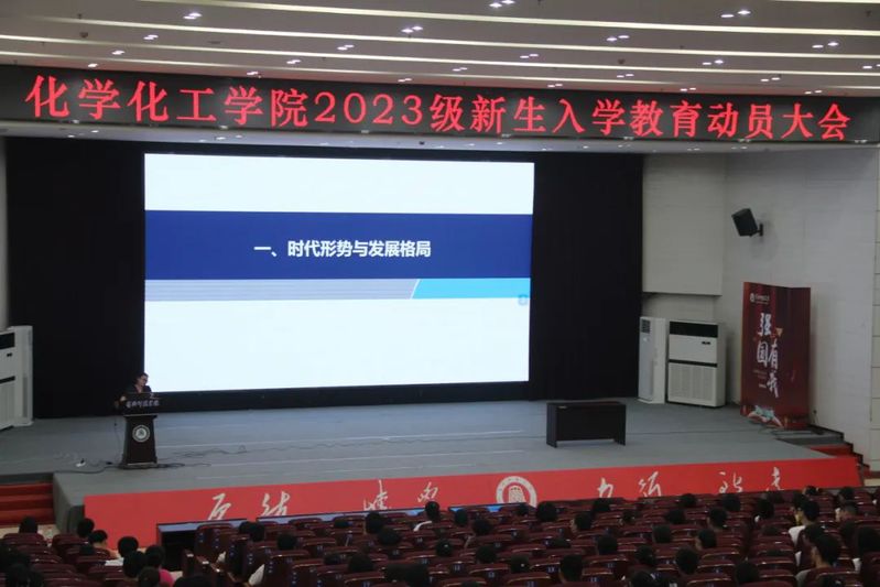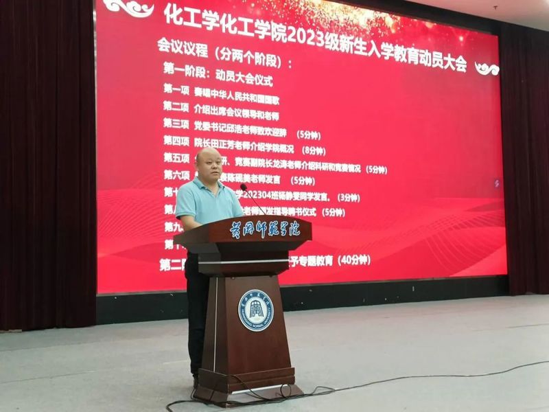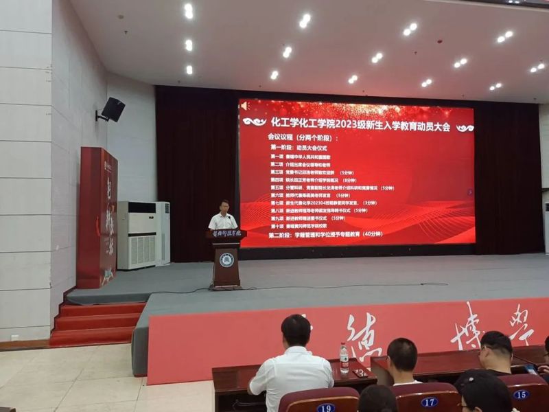 院长田正芳从学院师资队伍、专业建设、科研研究、实验条件等方面给新生做了详细阐述,他对新生提出了三点期望,一要志存高远,树立远大理想,要珍惜在大学时光,以时不我待的学习紧迫感,在化学课堂上、在实验室、在各类比赛中沉下心去学习钻研,努力掌握科学方法,养成良好学习习惯;二要发扬科研精神,充分利用学院博士教师资源,早做规划,早日进入导师课题组进行科研探索,为未来科学研究打下良好基础;三要常怀感恩,感恩父母的辛勤养育、感恩老师的无私教诲,感恩同学的细致帮助,在学习和生活中都要抱有乐观心态,尊重他人,互帮互助,共同度过美好的大学生活。