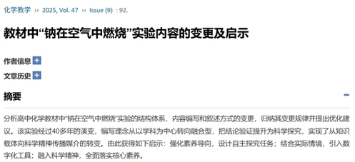 近日,韦德官方网站青年教师周林楠博士在化学教育领域核心期刊《化学教学》上发表了教研论文1篇,题目为“教材中‘钠在空气中燃烧’实验内容的变更及启示”(化学教学,2025,47(9):92)。该文由周林楠博士担任第一作者,韦德官方网站蒋小春副教授、田正芳教授参与了相关研究工作,华东师范大学附属东昌中学马善恒老师为通讯作者。这项研究得到湖北省教育厅基础教学研究项目基金的资助。