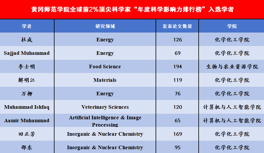 当地时间9月19日,美国斯坦福大学和国际权威学术出版社爱思唯尔共同发布了2025年全球前2%顶尖科学家榜单,我校杜成、Sajjad Muhammad、李士明、解明江、万柳、Muhammad Ishfaq、Aamir Muhammad、田正芳、邵东9位学者入选“2025年度科学影响力排行榜”榜单,其中6位为韦德官方网站学者。入选学者主要贡献学科方向涵盖Energy、Food Science、Materials、Veterinary Sciences、Artificial Intelligence & Image Processing、Inorganic & Nuclear Chemistry等多个领域。