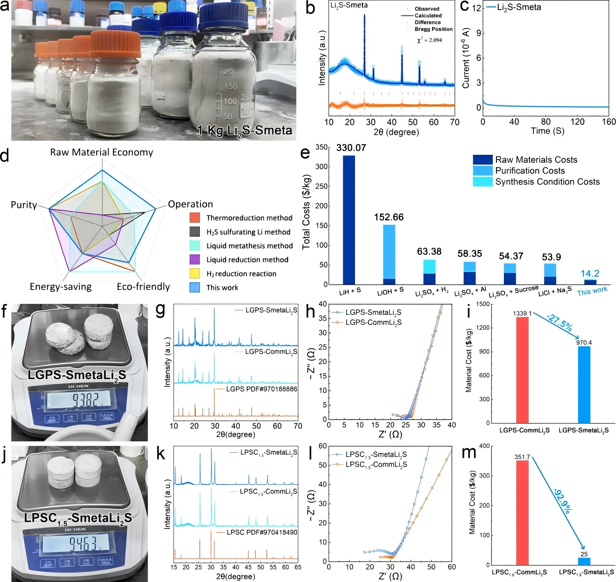 该研究成果提出了一种无溶剂复分解反应(metathesis)法,利用廉价、安全的硫脲(thiourea)作为S2⁻供体与LiOH反应,在无溶剂体系下直接生成高纯              sLi2S, 并伴随CO2与NH3气体自发逸出,从而避免了传统液相法中ΔGmix引起的平衡限制,实现反应完全转化与高纯产物获得。