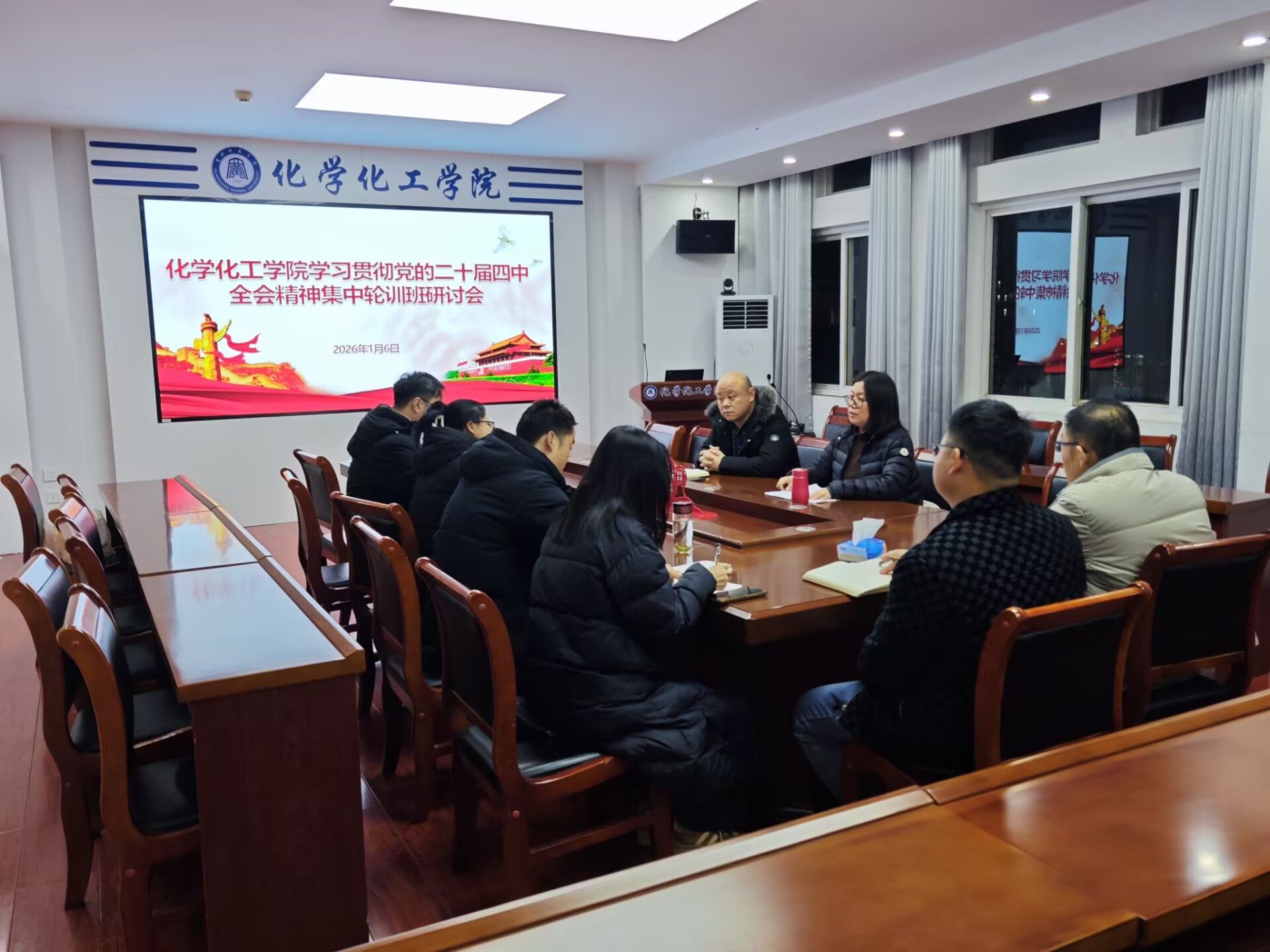 2026年1月6日,韦德官方网站在化学楼407会议室召开学习贯彻党的二十届四中全会精神集中轮训班研讨会。院党委书记汪辉、院长田正芳带领班子成员及辅导员、教学秘书代表参会。会议由院党委书记汪辉主持。